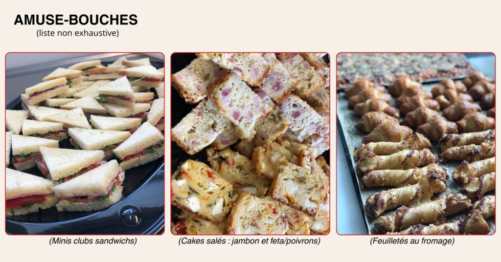 Amuse bouches, plateaux de charcuterie, salades et même desserts... Tout y est !
